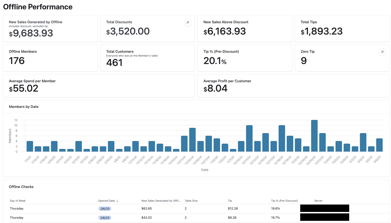 💰 Compare Offline Customers to Baseline – Compare Offline Member spend, tipping, and traffic to your non-Offline customers.