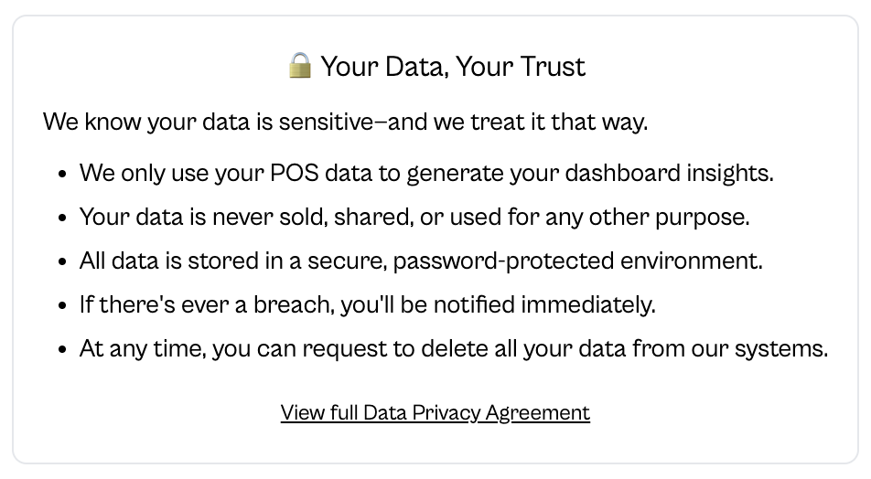 We take data privacy very seriously and we never share or sell your data. Any partner who links their POS system is automatically enrolled in our privacy policy (see abbreviated version below or at https://pos.letsgetoffline.com/welcome).